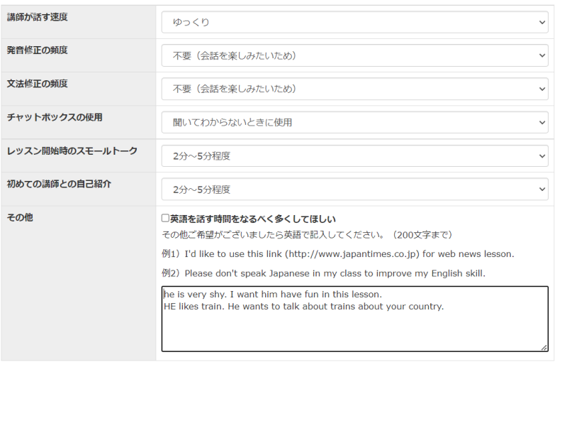忘れないでいただきたいのはレッスンの予約時に要望を記載しておくことができます。