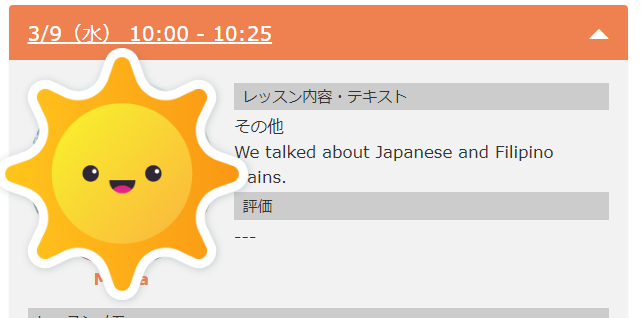 管理画面から先生の顔写真(太陽の部分は顔写真です)レッスンの内容を見ることができます。